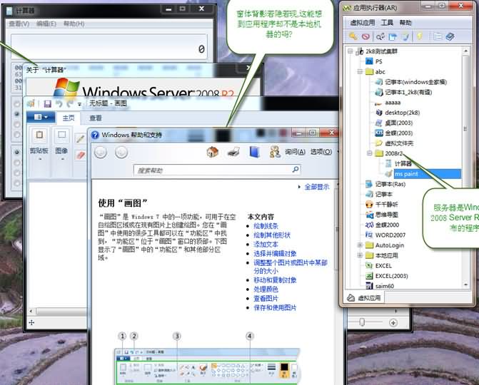 分支机构、异地办公等情况下,VA可以消除所有的空间距离差异,只要接通互联网,不受地域和距离的限制,就能运行VA服务器上安装的软件,就像自己的电脑扩展到了服务器上一样。这时的个人电脑实质上就是一台服务器的终端输入输出设备。软件运行在VA服务器上,终端用户模拟本地操作方式,远程使用服务器资源,称之为“虚拟应用”,是“云计算”的一种形式。那么,只要是能上网的电脑,就可以实现虚拟应用了吗?是的。不过,在通常情况下,你能够支配的是其中一部分资源。VA提供一整套授权和安全管理机制,资源调度机制,保证多用户系统的效率和安全。与单纯的“远程桌面”不同,VA的用户看到的是一个个“应用”:一个个应用软件、不同范围下共享(私有)文件夹。作为特例,远程桌面也可以是一个“应用”。